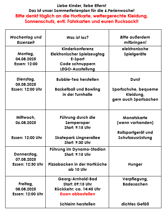 hier ist unser Angebotsplan für die 6. und leider schon letzte Sommerferienwoche.